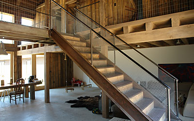 Stonington house: Reclaimed and adapted metal bridge and stairs, concrete countertops, and thin concrete shower panels.
